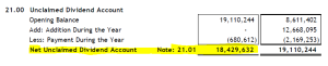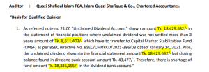 কোম্পানিটির নিরীক্ষক জানিয়েছে, কোম্পানিটি তার আর্থিক প্রতিবেদনে অবণ্টিত লভ্যাংশ এক কোটি ৮৪ লাখ ২৯ হাজার ৬৩২ টাকা উল্লেখ করেছে। কিন্তু কোম্পানিটির লভ্যাংশ সংক্রান্ত হিসাবে মাত্র ৪৩ হাজার ৪৭৭ টাকা রয়েছে। ঘাটতি রয়েছে এক কোটি ৮৩ লাখ ৮৬ হাজার ১৫৫ টাকা।