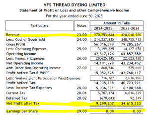কোম্পানি সূত্রে জানা গেছে, ব্যবসায়িকভাবে বেশ খারাপ অবস্থায় থাকা কোম্পানিটির সদ্য বিদায়ী বছরে রেভেনিউ বা বিক্রয় রাজস্ব কমেছে ৩৭ শতাংশ। গত হিসাব বছরে (৩০ জুন ২০২৪) ভিএফএস থ্রেডের বিক্রয় রাজস্ব হয়েছে ৪২ কোটি ৮০ লাখ ৪০ হাজার ৯৮০ টাকা। আর সদ্য বিদায়ী হিসাব বছরে তা এসে দাঁড়িয়েছে ২৭ কোটি দুই লাখ ৫৩ হাজার ৬৮৪ টাকা। এক বছরের ব্যবধানে বিক্রয় রাজস্ব কমেছে ১৫ কোটি ৭৭ লাখ ৮৭ হাজার ২৯৬ টাকা।