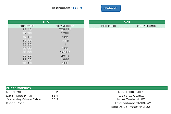 এদিন বেলা ১১টা পযর্ন্ত শেয়ারটির দর ৩.৫ টাকা বা ৯.৭৫ শতাংশ বেড়েছে সর্বশেষ ৩৯.৪০ টাকা লেনদেন হয়। এসময়ে কোম্পানিটি ৪ হাজার ১৮৭ বার হাত বদল হয়ে ৩৭ লাখ ৯ হাজার ৭৪২টি শেয়ার লেনদেন করেছে। যার আর্থিক মূল্য ১৪ কোটি ১১ লাখ ৮০ হাজার টাকা।