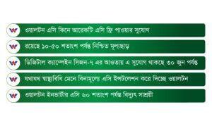 ওয়ালটন এসি সেলস নেটওয়ার্ক ও ডেভেলপমেন্টের সমন্বয়ক খোন্দকার শাহরিয়ার মুরশিদ জানান, দেশজুড়ে তাদের রয়েছে ১৭ হাজারেরও বেশি সেলস আউটলেট। যেখানে যেকোনো ব্র্যান্ডের পুরনো এসি বদলে ২৫ শতাংশ ডিসকাউন্টে কেনা যাচ্ছে ওয়ালটনের নতুন এসি। এছাড়া, মাত্র ৪,৯০০ টাকা ডাউনপেমেন্টে এসি দিচ্ছে ওয়ালটন। রয়েছে ৩৬ মাসের সহজ কিস্তিসহ জিরো ইন্টারেস্টে ১২ মাসের ইএমআই সুবিধা। তবে এক্সচেঞ্জ এবং কিস্তি সুবিধায় এসি কিনলে ডিজিটাল ক্যাম্পেইনের সুবিধা মিলবে না। পাশাপাশি ঘরে বসেই ওয়ালটনের নিজস্ব অনলাইন শপ ‘ইপ্লাজা ডট ওয়ালটনবিডি ডটকম’ (https://eplaza.waltonbd.com) থেকে ক্রেতারা তাদের পছন্দের এসি কিনতে পারছেন। অনলাইন থেকে এসি কেনায় ডিজিটাল ক্যাম্পেইনের সুবিধা উপভোগ করা যাবে। যথাযথ সুরক্ষা ব্যবস্থা ও স্বাস্থ্যবিধি মেনে ওয়ালটনের দক্ষ টেকনিশিয়ানগণ বিনামূল্যে গ্রাহকদের এসি ইন্সটলেশন করে দিচ্ছেন। বাংলাদেশে একমাত্র ওয়ালটনই এসিতে এক বছরের রিপ্লেসমেন্ট সুবিধা দিচ্ছে। পাশাপাশি ওয়ালটনের ইনভার্টার এসির কম্প্রেসরে রয়েছে ১০ বছরের গ্যারান্টি। আর নন-ইনভার্টার কম্প্রেসরের গ্যারান্টি ৩ বছর থেকে বাড়িয়ে ৫ বছর করেছে ওয়ালটন। দ্রুত ও সর্বোত্তম বিক্রয়োত্তর সেবা দিতে আইএসও সনদপ্রাপ্ত সার্ভিস ম্যানেজমেন্ট সিস্টেমের আওতায় সারা দেশে রয়েছে ৭৪টি সার্ভিস সেন্টার। ওয়ালটনের দক্ষ ও অভিজ্ঞ প্রকৌশলী এবং টেকনিশিয়ানগণ প্রতি ১০০ দিন পর পর এসির ক্রেতাদের ফ্রি সার্ভিসিং দিচ্ছেন।