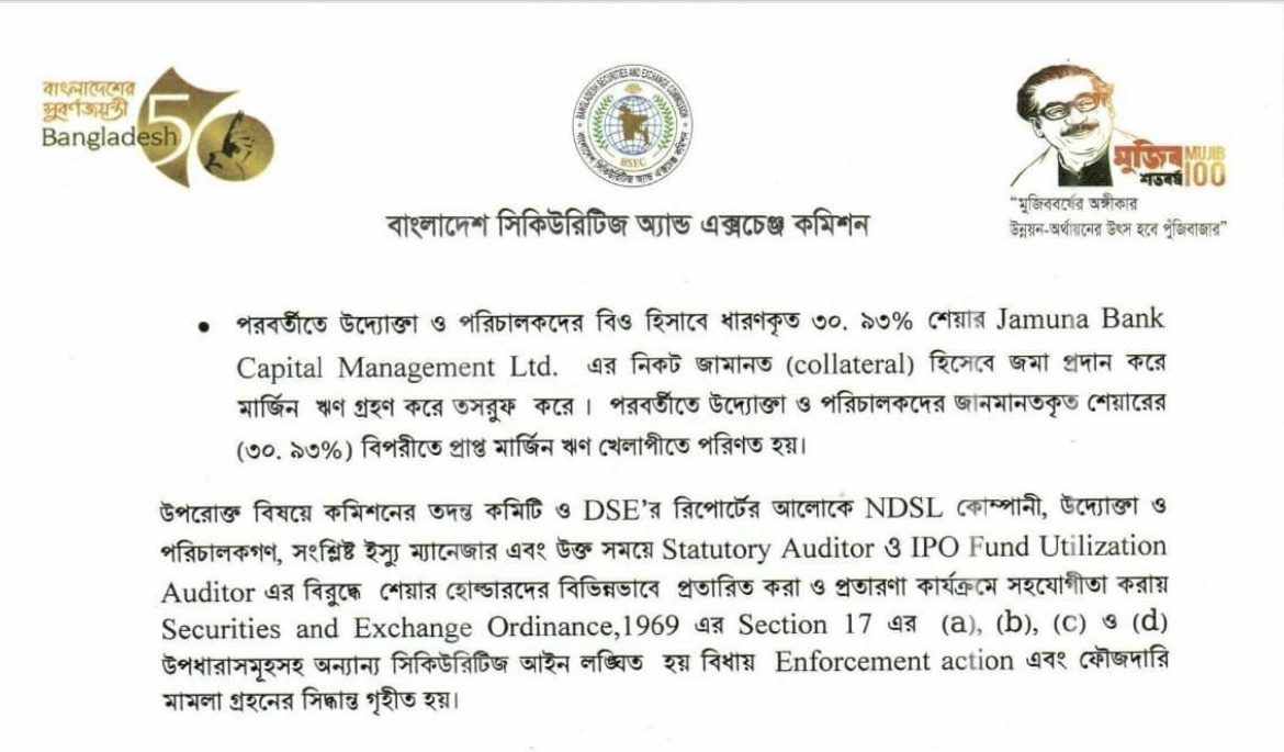 আর্থিক হিসাবে মিথ্যা তথ্য প্রদান ও আইপিও ফান্ড আত্মসাৎ করার অভিযোগে উল্লেখিত কোম্পানি, ৩ ইস্যু ম্যানেজার ও অডিটরের বিরুদ্ধে এনফোর্সমেন্ট অ্যাকশান ও ফৌজদারি মামলা করার সিদ্ধান্ত নিয়েছে নিয়ন্ত্রক সংস্থা বাংলাদেশ সিকিউরিটিজ অ্যান্ড এক্সচেঞ্জ কমিশন (বিএসইসি)। বুধবার (২৮ সেপ্টেম্বর) বিএসইসির ৮৪০তম নিয়মিত কমিশন সভায় এই সিদ্ধান্ত নেওয়া হয়েছে।