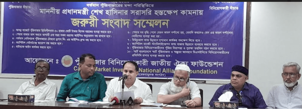 ডেইলি শেয়ারবাজার রিপোর্ট: দেশের শেয়ারবাজারের চলমান অস্থিরতায় আজ ২৯ মে ঢাকার প্রেস ক্লাবে সংবাদ সম্মেলন করেছেন বিনিয়োগকারীরা। আয়োজিত সংবাদ সম্মেলনে শেয়ারবাজার ভালো করতে মাননীয় প্রধানমন্ত্রী শেখ হাসিনার হস্তক্ষেপ কামনা করে ১২ দফা দাবি তুলে ধরেছেন পুঁজিবাজার বিনিয়োগকারী জাতীয় ঐক্য ফাউন্ডেশন (ক্যাপমিনাফ)। ১২ দফা দাবিগুলো হলো: