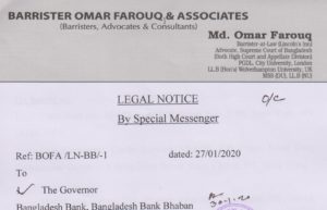 সম্প্রতি দূর্নীতি দমন কমিশনের অনুসন্ধান এবং বিভিন্ন পত্রিকার অনুসন্ধানী রিপোর্ট অনুযায়ী তিনি যে ৩৫০০ কোটি টাকা লুট করে পালিয়ে গেছেন, এই টাকা তারই অংশ বিশেষ। আইনী নোটিশে আরো বলা হয়েছে, পিকে হালদার শুধু টাকা তসরূপ করেই খান্ত হননি, তিনি এবং তার নিয়ন্ত্রনাধীন অবৈধ বোর্ড কর্তৃক বিআইএফসি’তে বিদেশী বিনিয়োগকারী প্রতিষ্ঠান গুলির শেয়ার কুক্ষিগত করার পায়তারা করছে। এতে করে বিনিয়োগকারীরা তাদের বিনিয়োগ নিয়েও শঙ্কিত। তাই আইনী নোটিশে বিদেশী শেয়ার হোল্ডার প্রতিষ্ঠান গুলোর পক্ষ থেকে বাংলাদেশ ব্যাংক গভর্নরের নিকট অনুরোধ করা হয়েছে – যেন আগামী ৩ দিনের মধ্যে পিকে হালদার এর এ্যাসোসিয়েটস এর অবৈধ বোর্ডকে অপসারণ করে ২০১৮ সালে এজিএম’এ প্রায় ৬৫ শতাংশ শেয়ার হোল্ডারদের প্রত্যক্ষ ভোটে নির্বাচিত বোর্ডের কাছে দায়িত্ব হস্তান্তর করা হয় এবং পিকে হালদার এর তসরূপকৃত টাকা পুনোরূদ্ধারে যথাযথ ব্যবস্থা গ্রহণ করা হয়। অন্যথায় কোম্পানী এ্যাক্ট ১৯৯৪ অনুযায়ী যথাযথ আইনী ব্যবস্থা গ্রহণ করা হবে।