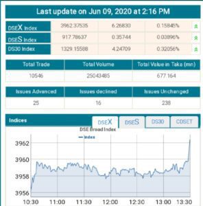 আজ দিন শেষে ডিএসইর ব্রড ইনডেক্স আগের দিনের চেয়ে ৬ পয়েন্ট ক বেড়ে অবস্থান করছে ৩৯৬২ পয়েন্টে। আর ডিএসই শরিয়াহ সূচক ০.৩৫ পয়েন্ট বেড়ে অবস্থান করছে ৯১৭ পয়েন্টে এবং ডিএসই ৩০ সূচক ৪ পয়েন্ট বেড়ে অবস্থান করছে ১৩২৯ পয়েন্টে। দিনভর লেনদেন হওয়া ২৭৯টি কোম্পানি ও মিউচ্যুয়াল ফান্ডের মধ্যে দর বেড়েছে ২৫টির, কমেছে ১৬টির এবং অপরিবর্তিত রয়েছে ২৩৮টির। আর দিন শেষে লেনদেন হয়েছে ৬৭ কোটি ৭১ লাখ ৬৪ হাজার টাকা।