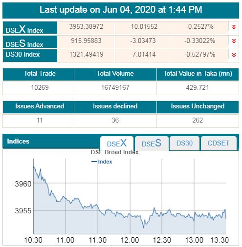 আজ দিন শেষে ডিএসইর ব্রড ইনডেক্স আগের দিনের চেয়ে ১০ পয়েন্ট কমে অবস্থান করছে ৩৯৫৩ পয়েন্টে। আর ডিএসই শরিয়াহ সূচক ৩ পয়েন্ট কমে অবস্থান করছে ৯১৫ পয়েন্টে এবং ডিএসই ৩০ সূচক ৭ পয়েন্ট কমে অবস্থান করছে ১৩২১ পয়েন্টে। দিনভর লেনদেন হওয়া ৩০৯টি কোম্পানি ও মিউচ্যুয়াল ফান্ডের মধ্যে দর বেড়েছে ১১টির, কমেছে ৩৬টির এবং অপরিবর্তিত রয়েছে ২৬২টির। আর দিন শেষে লেনদেন হয়েছে ৪২ কোটি ৯৭ লাখ ২১ হাজার টাকা।