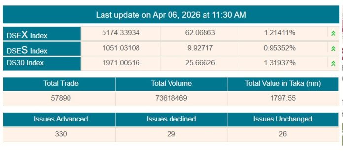 সূত্র মতে, এদিন ডিএসইর লেনদেন শুরুর প্রথম দেড় ঘণ্টা অর্থাৎ বেলা ১১টা ৩০ পর্যন্ত ডিএসইর প্রধান সূচক বা ‘ডিএসইএক্স’ ৬২ দশমিক ০৬ পয়েন্ট বেড়ে অবস্থান করছে ৫ হাজার ১৭৪ পয়েন্টে।
