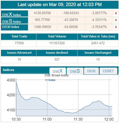 বাজার বিশ্লেষণে দেখা গেছে, আজ দুপুর ১২টায় ডিএসই ব্রড ইনডেক্স আগের দিনের চেয়ে ১৬৬ পয়েন্ট কমে অবস্থান করছে ৪১২০ পয়েন্টে। আর ডিএসই শরিয়াহ সূচক ৪৩ পয়েন্ট কমে অবস্থান করছে ৯৫৫ পয়েন্টে এবং ডিএসই–৩০ সূচক ৫৪ পয়েন্ট কমে অবস্থান করছে ১৩৮০ পয়েন্টে। এ সময় লেনদেন হওয়া ৩৫৩টি কোম্পানি ও মিউচ্যুয়াল ফান্ডের মধ্যে দর বেড়েছে ১৬টির, দর কমেছে ৩২৭টির এবং দর পরিবর্তীত রয়েছে ১০টির। এ সময় টাকার অংকে লেনদেন হয়েছে ২৪৫ কোটি ১৪ লাখ ৭২ হাজার টাকা।