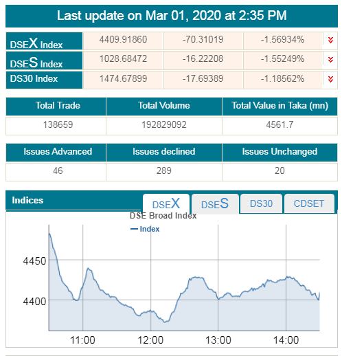 আজ দিন শেষে ডিএসইর ব্রড ইনডেক্স আগের দিনের চেয়ে ৭০ পয়েন্ট কমে অবস্থান করছে ৪৪০৯ পয়েন্টে। আর ডিএসই শরিয়াহ সূচক ১৬ পয়েন্ট কমে অবস্থান করছে ১০২৮ পয়েন্টে এবং ডিএসই ৩০ সূচক ১৭ পয়েন্ট কমে অবস্থান করছে ১৪৭৪ পয়েন্টে। দিনভর লেনদেন হওয়া ৩৫৫টি কোম্পানি ও মিউচ্যুয়াল ফান্ডের মধ্যে দর বেড়েছে ৪৬টির, কমেছে ২৮৯টির এবং অপরিবর্তিত রয়েছে ২০টির। আর দিন শেষে লেনদেন হয়েছে ৪৫৬ কোটি ১৭ লাখ টাকা।