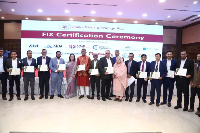 গতকাল ১১ মার্চ ২০২৬ তারিখে ডিএসই মাল্টিপারপাস হলে আয়োজিত এক অনুষ্ঠানে ডিএসই’র ব্যবস্থাপনা পরিচালক নুজহাত আনোয়ার ব্রোকারেজ হাউসগুলোকে ফিক্স সার্টিফিকেশন প্রদান করেন। এসময় উপস্থিত ছিলেন ডিএসই’র প্রধান পরিচালনা কর্মকর্তা মোহাম্মদ আসাদুর রহমান, এফসিএস; প্রধান প্রযুক্তি কর্মকর্তা ড. মোঃ আসিফুর রহমান; আইসিটি ডিভিশনের মহাব্যবস্থাপক মোঃ তারিকুল ইসলাম; উপ-মহাব্যবস্থাপক হাসানুল করিমসহ ডিএসই’র ঊর্ধ্বতন কর্মকর্তাবৃন্দ।