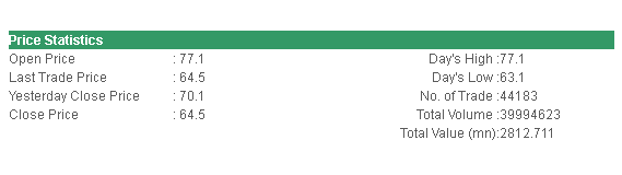 আজ কোম্পানিটির ২৮১.২৭ কোটি টাকায় ৪ কোটি শেয়ার লেনদেন হয়েছে। আর শেয়ারটি ৬৩.১০ টাকা থেকে ৭৭.১০ টাকার মধ্যে লেনদেন হয়েছে।
