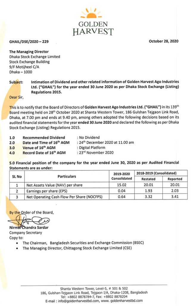 Homeপ্রাইস সেন্সিটিভ ইনফরমেশনDividend Declaration of Golden Harvest Agro Industries Limited Your browser does not support the video tag. Dividend Declaration of Golden Harvest Agro Industries Limited অক্টোবর ২৮, ২০২০ Share FacebookTwitterPinterestWhatsApp Share FacebookTwitterPinterestWhatsApp Previous articleগোল্ডেন হার্ভেস্টের ডিভিডেন্ড ঘোষণাNext articleএকনজরে ৩১ কোম্পানির ডিভিডেন্ড দেখে নিন RELATED ARTICLES প্রাইস সেন্সিটিভ ইনফরমেশন Price Sensitive Information (Dividend): Nitol Insurance PLC এপ্রিল ১, ২০২৬ প্রাইস সেন্সিটিভ ইনফরমেশন Price Sensitive Information: Pubali Bank PLC মার্চ ১১, ২০২৬ প্রাইস সেন্সিটিভ ইনফরমেশন Price Sensitive Information: Pubali Bank PLC মার্চ ১১, ২০২৬ Most Popular স্ত্রী-পুত্র-কন্যাকে শেয়ার উপহার দেবেন ক্রাউন সিমেন্টের ভাইস-চেয়ারম্যান এপ্রিল ১৬, ২০২৬ বাংলাদেশ ন্যাশনাল ইন্স্যুরেন্সের ডিভিডেন্ড ঘোষণা এপ্রিল ১৬, ২০২৬ বোর্ড সভার তারিখ জানিয়েছে জেএমআই সিরিঞ্জস এপ্রিল ১৬, ২০২৬ পুজিবাজারের উন্নয়নে শীর্ষ কর্মকর্তাদের সাথে বৈঠক এপ্রিল ১৬, ২০২৬ Load more Recent Comments
