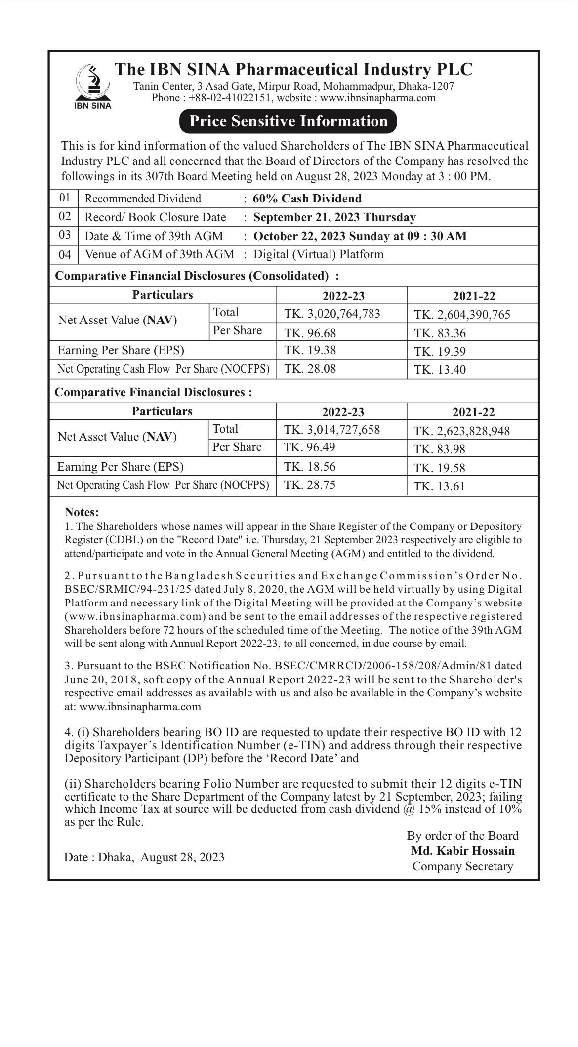 Homeপ্রাইস সেন্সিটিভ ইনফরমেশনPrice Sensitive Information (Dividend): The IBN SINA Pharmaceutical Industry PLC Your browser does not support the video tag. Price Sensitive Information (Dividend): The IBN SINA Pharmaceutical Industry PLC আগস্ট ২৮, ২০২৩ Share FacebookTwitterPinterestWhatsApp Share FacebookTwitterPinterestWhatsApp Previous articleইবনে সিনার ডিভিডেন্ড ঘোষণাNext articleবাংলাদেশ সাবমেরিন ক্যাবলের ডিভিডেন্ড ঘোষণা RELATED ARTICLES প্রাইস সেন্সিটিভ ইনফরমেশন Price Sensitive Information (Dividend): Nitol Insurance PLC এপ্রিল ১, ২০২৬ প্রাইস সেন্সিটিভ ইনফরমেশন Price Sensitive Information: Pubali Bank PLC মার্চ ১১, ২০২৬ প্রাইস সেন্সিটিভ ইনফরমেশন Price Sensitive Information: Pubali Bank PLC মার্চ ১১, ২০২৬ Most Popular স্ত্রী-পুত্র-কন্যাকে শেয়ার উপহার দেবেন ক্রাউন সিমেন্টের ভাইস-চেয়ারম্যান এপ্রিল ১৬, ২০২৬ বাংলাদেশ ন্যাশনাল ইন্স্যুরেন্সের ডিভিডেন্ড ঘোষণা এপ্রিল ১৬, ২০২৬ বোর্ড সভার তারিখ জানিয়েছে জেএমআই সিরিঞ্জস এপ্রিল ১৬, ২০২৬ পুজিবাজারের উন্নয়নে শীর্ষ কর্মকর্তাদের সাথে বৈঠক এপ্রিল ১৬, ২০২৬ Load more Recent Comments