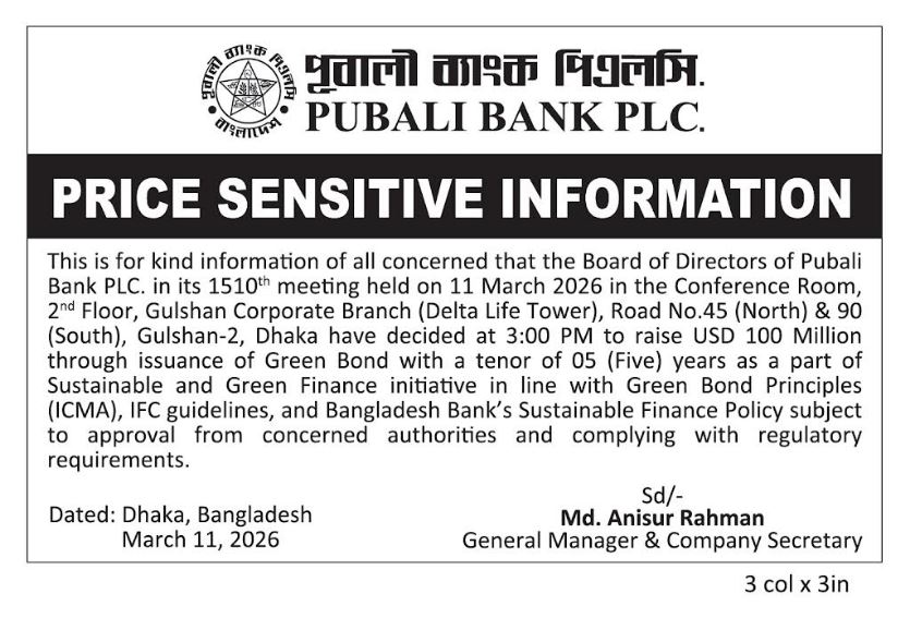 Homeপ্রাইস সেন্সিটিভ ইনফরমেশনPrice Sensitive Information: Pubali Bank PLC Your browser does not support the video tag. Price Sensitive Information: Pubali Bank PLC মার্চ ১১, ২০২৬ Share FacebookTwitterPinterestWhatsApp Share FacebookTwitterPinterestWhatsApp Previous articleবাটা সু’র লোকসানের আড়ালে ভিন্ন কিছু, তদন্তের দাবি বিনিয়োগকারীদের (পর্ব-১)Next articlePrice Sensitive Information: Pubali Bank PLC RELATED ARTICLES প্রাইস সেন্সিটিভ ইনফরমেশন Price Sensitive Information (Dividend): Nitol Insurance PLC এপ্রিল ১, ২০২৬ প্রাইস সেন্সিটিভ ইনফরমেশন Price Sensitive Information: Pubali Bank PLC মার্চ ১১, ২০২৬ প্রাইস সেন্সিটিভ ইনফরমেশন Price Sensitive Information (Q2): Wata Chemicals Limited. জানুয়ারি ২৯, ২০২৬ Most Popular হাক্কানি পাল্পের ইপিএস প্রকাশ এপ্রিল ২৬, ২০২৬ আনলিমা ইয়ার্নের তৃতীয় প্রান্তিক প্রকাশ এপ্রিল ২৬, ২০২৬ বিকেলে আসছে ৭ কোম্পানির ডিভিডেন্ড ও ইপিএস এপ্রিল ২৬, ২০২৬ একমি পেস্টিসাইডসের আইপিও তহবিল ব্যবহারের সময় বাড়ানোর আবেদন বাতিল এপ্রিল ২৫, ২০২৬ Load more Recent Comments