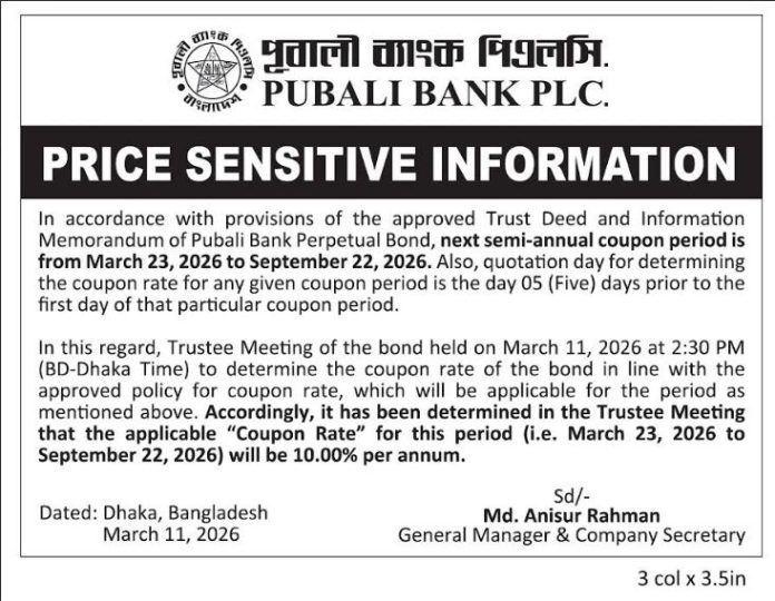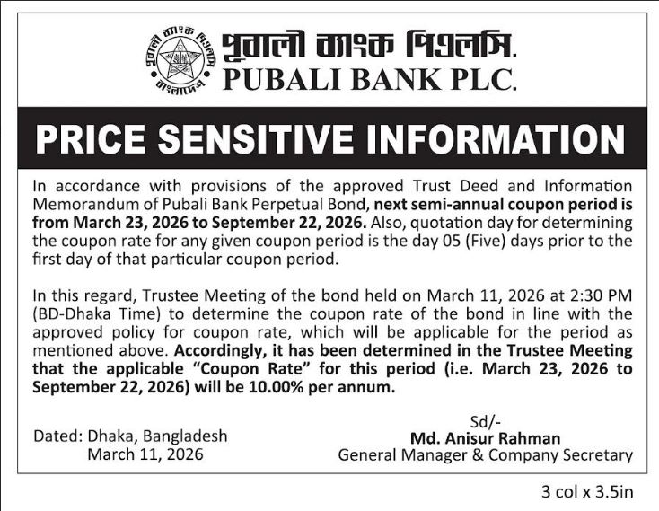 Homeপ্রাইস সেন্সিটিভ ইনফরমেশনPrice Sensitive Information: Pubali Bank PLC Your browser does not support the video tag. Price Sensitive Information: Pubali Bank PLC মার্চ ১১, ২০২৬ Share FacebookTwitterPinterestWhatsApp Share FacebookTwitterPinterestWhatsApp Previous articlePrice Sensitive Information: Pubali Bank PLCNext articleব্লক মার্কেটে ৩৫ কোটি টাকার লেনদেন RELATED ARTICLES প্রাইস সেন্সিটিভ ইনফরমেশন Price Sensitive Information (Dividend): Nitol Insurance PLC এপ্রিল ১, ২০২৬ প্রাইস সেন্সিটিভ ইনফরমেশন Price Sensitive Information: Pubali Bank PLC মার্চ ১১, ২০২৬ প্রাইস সেন্সিটিভ ইনফরমেশন Price Sensitive Information (Q2): Wata Chemicals Limited. জানুয়ারি ২৯, ২০২৬ Most Popular হাক্কানি পাল্পের ইপিএস প্রকাশ এপ্রিল ২৬, ২০২৬ আনলিমা ইয়ার্নের তৃতীয় প্রান্তিক প্রকাশ এপ্রিল ২৬, ২০২৬ বিকেলে আসছে ৭ কোম্পানির ডিভিডেন্ড ও ইপিএস এপ্রিল ২৬, ২০২৬ একমি পেস্টিসাইডসের আইপিও তহবিল ব্যবহারের সময় বাড়ানোর আবেদন বাতিল এপ্রিল ২৫, ২০২৬ Load more Recent Comments
