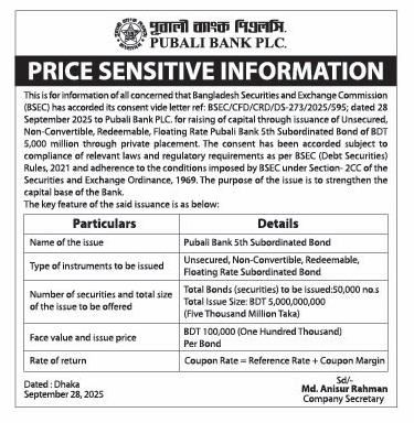 Homeপ্রাইস সেন্সিটিভ ইনফরমেশনPrice Sensitive Information: Pubali Bank PLC Your browser does not support the video tag. Price Sensitive Information: Pubali Bank PLC সেপ্টেম্বর ২৮, ২০২৫ Share FacebookTwitterPinterestWhatsApp Share FacebookTwitterPinterestWhatsApp Previous articleডিইউজে ইনকিলাব ইউনিট পুনর্গঠন: হাসান সোহেল চিফ ও একলাছ ডেপুটিNext articleবিনিয়োগকারীদের হতাশ করল তাল্লু স্পিনিং RELATED ARTICLES প্রাইস সেন্সিটিভ ইনফরমেশন Price Sensitive Information (Dividend): Nitol Insurance PLC এপ্রিল ১, ২০২৬ প্রাইস সেন্সিটিভ ইনফরমেশন Price Sensitive Information: Pubali Bank PLC মার্চ ১১, ২০২৬ প্রাইস সেন্সিটিভ ইনফরমেশন Price Sensitive Information: Pubali Bank PLC মার্চ ১১, ২০২৬ Most Popular বোর্ড সভার তারিখ জানিয়েছে এনসিসি ব্যাংক এপ্রিল ১৯, ২০২৬ আজ লেনদেনের শীর্ষে যারা এপ্রিল ১৯, ২০২৬ আজ দর পতনের শীর্ষে যারা এপ্রিল ১৯, ২০২৬ আজ দর বৃদ্ধির শীর্ষে যারা এপ্রিল ১৯, ২০২৬ Load more Recent Comments