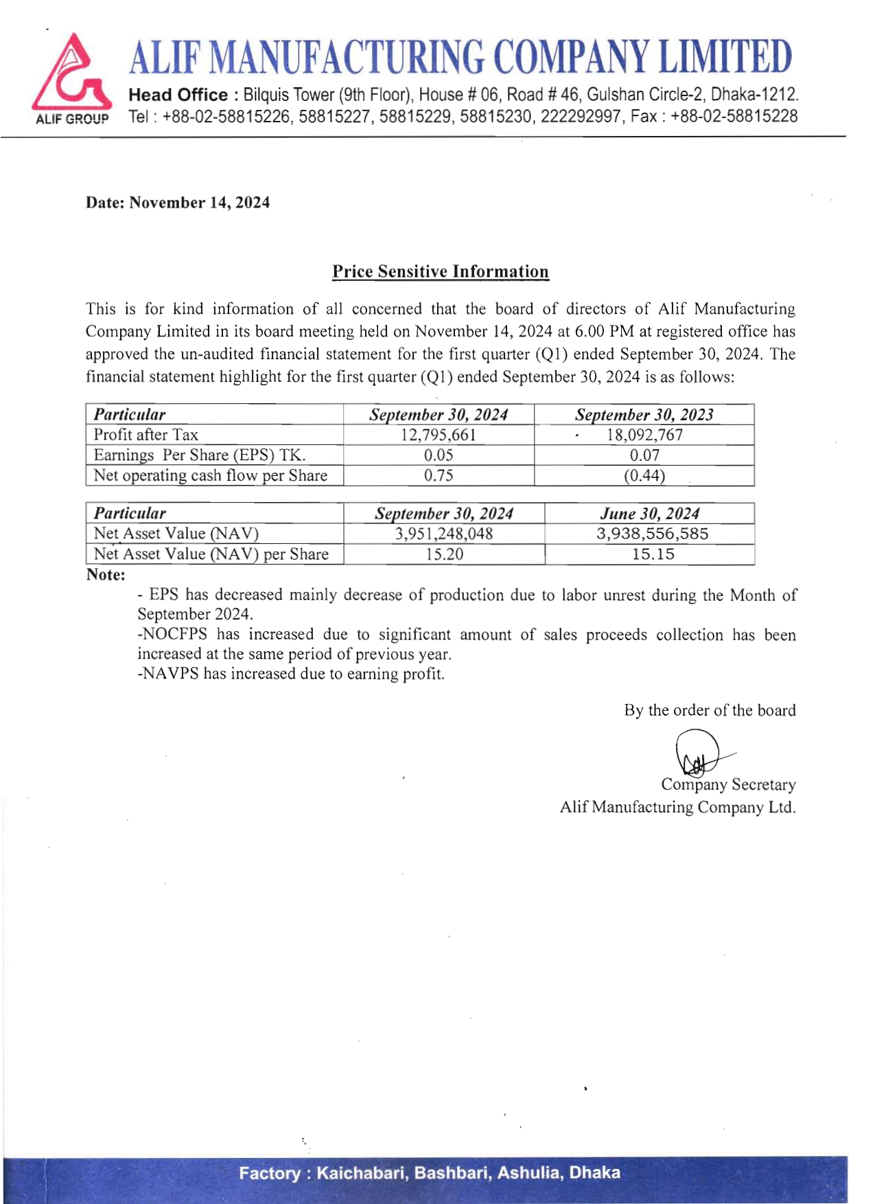 Homeপ্রাইস সেন্সিটিভ ইনফরমেশনPrice Sensitive Information (Q1): Alif Manufacturing Company Ltd. Your browser does not support the video tag. Price Sensitive Information (Q1): Alif Manufacturing Company Ltd. নভেম্বর ১৪, ২০২৪ Share FacebookTwitterPinterestWhatsApp Share FacebookTwitterPinterestWhatsApp Previous articleটেকনো ড্রাগসের প্রথম প্রান্তিক প্রকাশNext articleএসিআইয়ের ইপিএস প্রকাশ RELATED ARTICLES প্রাইস সেন্সিটিভ ইনফরমেশন Price Sensitive Information (Q2): Wata Chemicals Limited. জানুয়ারি ২৯, ২০২৬ প্রাইস সেন্সিটিভ ইনফরমেশন Price Sensitive Information(Q2): INDO-BANGLA PHARMACEUTICALS LIMITED. জানুয়ারি ২৯, ২০২৬ প্রাইস সেন্সিটিভ ইনফরমেশন Price Sensitive Information (Q2 Financial): Sonali Paper & Board Mills Ltd. জানুয়ারি ২৯, ২০২৬ Most Popular সূচকের মিশ্র প্রতিক্রিয়ায় লেনদেন ৫২৩ কোটি টাকা মার্চ ১১, ২০২৬ আজ লেনদেনের শীর্ষে যারা মার্চ ১১, ২০২৬ আজ দর বৃদ্ধির শীর্ষে যারা মার্চ ১১, ২০২৬ আজ দর পতনের শীর্ষে যারা মার্চ ১১, ২০২৬ Load more Recent Comments