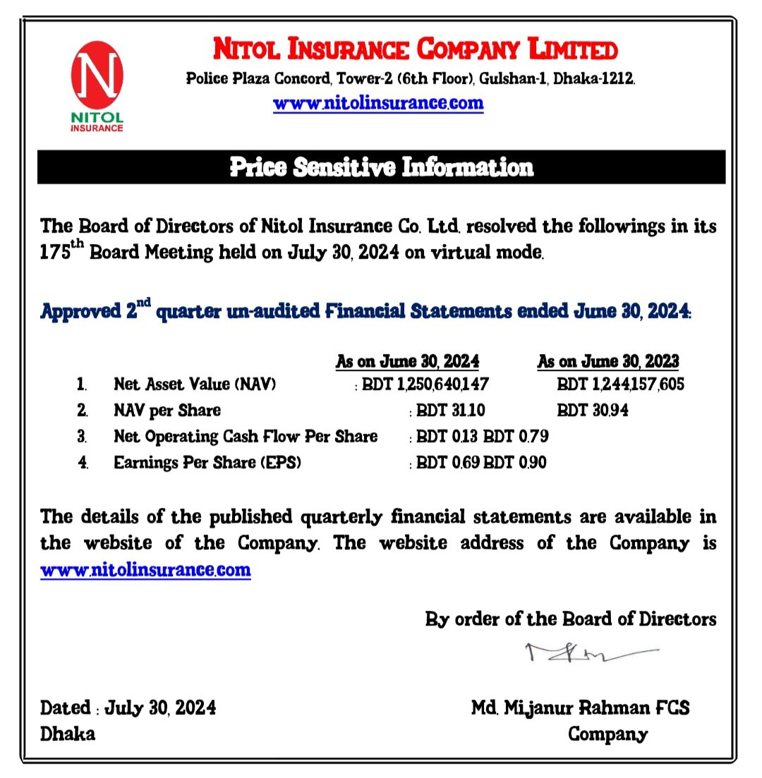 Homeপ্রাইস সেন্সিটিভ ইনফরমেশনPrice Sensitive Information (Q2): Nitol Insurance Company Ltd Your browser does not support the video tag. Price Sensitive Information (Q2): Nitol Insurance Company Ltd জুলাই ৩১, ২০২৪ Share FacebookTwitterPinterestWhatsApp Share FacebookTwitterPinterestWhatsApp Previous articleনিটল ইন্স্যুরেন্সের ১৭৫তম বোর্ড সভা অনুষ্ঠিতNext articleবে লিজিংয়ের বানিজ্যিক স্পেস বিক্রির সিদ্ধান্ত RELATED ARTICLES প্রাইস সেন্সিটিভ ইনফরমেশন Price Sensitive Information (Q2): Wata Chemicals Limited. জানুয়ারি ২৯, ২০২৬ প্রাইস সেন্সিটিভ ইনফরমেশন Price Sensitive Information(Q2): INDO-BANGLA PHARMACEUTICALS LIMITED. জানুয়ারি ২৯, ২০২৬ প্রাইস সেন্সিটিভ ইনফরমেশন Price Sensitive Information (Q2 Financial): Sonali Paper & Board Mills Ltd. জানুয়ারি ২৯, ২০২৬ Most Popular নারী ক্ষমতায়ন ও সমতা রক্ষার অঙ্গিকার নিয়ে এনার্জিপ্যাক ফ্যাশনসের নারী দিবস উদযাপন মার্চ ৮, ২০২৬ আন্তর্জাতিক নারী দিবসে সফল নারী উদ্যোক্তাদের সম্মাননা দিল ইউসিবি মার্চ ৮, ২০২৬ ইসলামী ব্যাংকের বোর্ড সভা অনুষ্ঠিত মার্চ ৮, ২০২৬ আন্তর্জাতিক নারী দিবস ২০২৬ উপলক্ষে কুষ্টিয়ার সুবিধাবঞ্চিত মেধাবী ছাত্রীদের মাঝে ‘স্বপ্ন সারথি’ সাইকেল বিতরণ করেছে এমটিবি ফাউন্ডেশন মার্চ ৮, ২০২৬ Load more Recent Comments