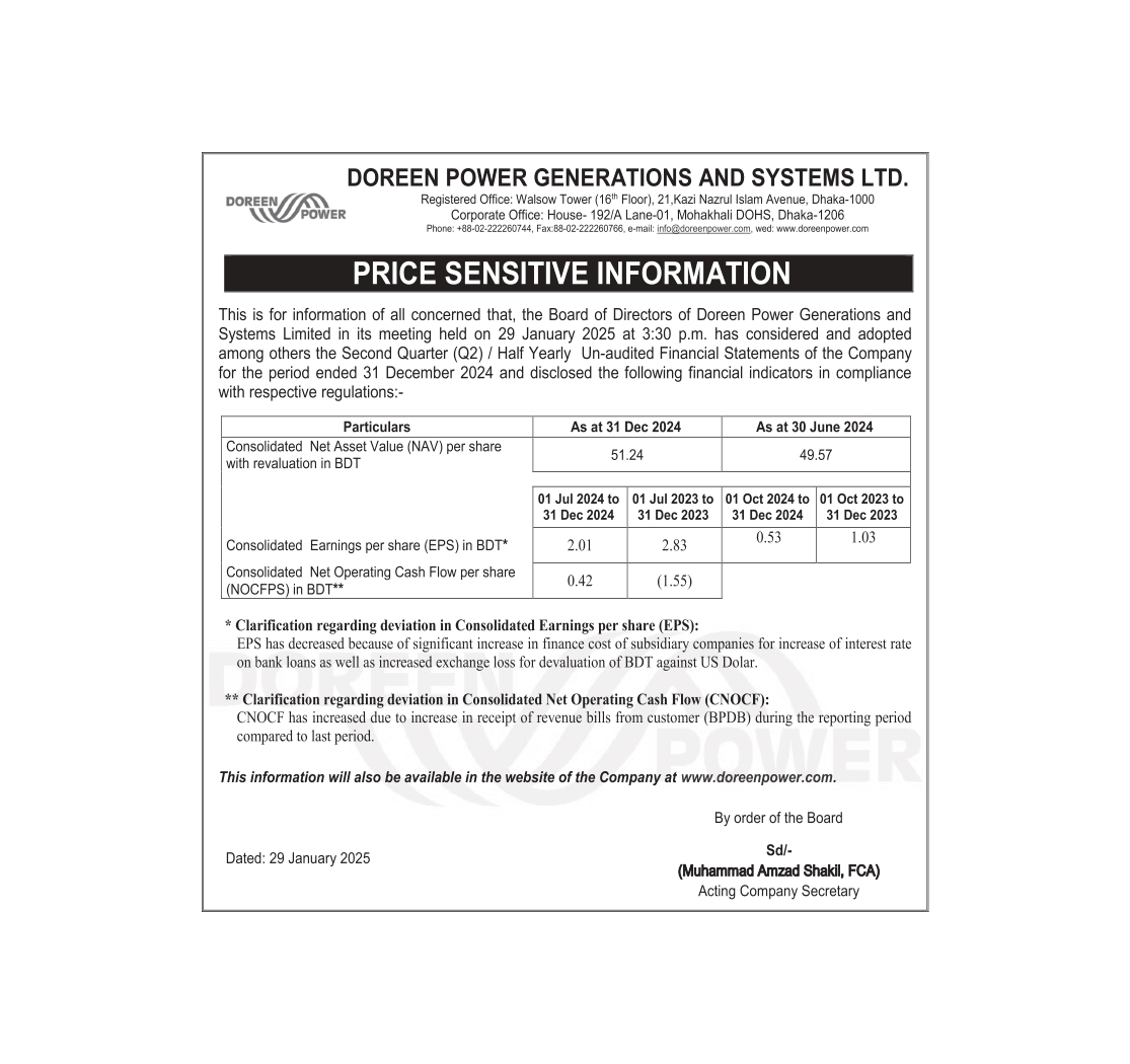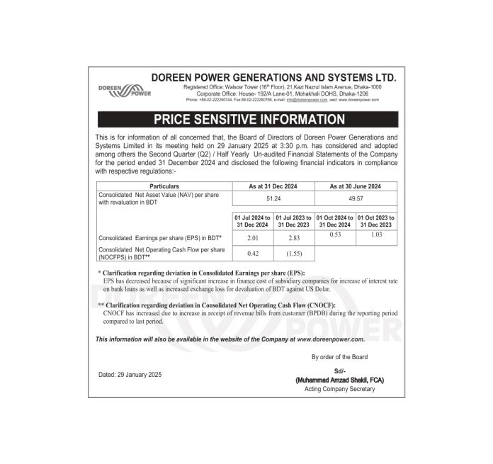 Homeপ্রাইস সেন্সিটিভ ইনফরমেশনPrice Sensitive Information(Q2): Doreen Power Generations and Systems Limited Your browser does not support the video tag. Price Sensitive Information(Q2): Doreen Power Generations and Systems Limited জানুয়ারি ২৯, ২০২৫ Share FacebookTwitterPinterestWhatsApp Share FacebookTwitterPinterestWhatsApp Previous articleডরিন পাওয়ারের দ্বিতীয় প্রান্তিক প্রকাশNext articleUn-Audited Financial Statement (Q2): Doreen Power Generations and Systems Limited RELATED ARTICLES প্রাইস সেন্সিটিভ ইনফরমেশন Price Sensitive Information (Dividend): Nitol Insurance PLC এপ্রিল ১, ২০২৬ প্রাইস সেন্সিটিভ ইনফরমেশন Price Sensitive Information: Pubali Bank PLC মার্চ ১১, ২০২৬ প্রাইস সেন্সিটিভ ইনফরমেশন Price Sensitive Information: Pubali Bank PLC মার্চ ১১, ২০২৬ Most Popular মোজাফ্ফর হোসেন স্পিনিংয়ের ক্রেডিট রেটিং প্রকাশ এপ্রিল ১৯, ২০২৬ বোর্ড সভার তারিখ জানিয়েছে ইউনাইটেড ইন্স্যুরেন্স এপ্রিল ১৯, ২০২৬ বোর্ড সভার তারিখ জানিয়েছে মেঘনা কনডেন্সড মিল্ক এপ্রিল ১৯, ২০২৬ বোর্ড সভার তারিখ জানিয়েছে হাইডেলবার্গ ম্যাটেরিয়ালস এপ্রিল ১৯, ২০২৬ Load more Recent Comments