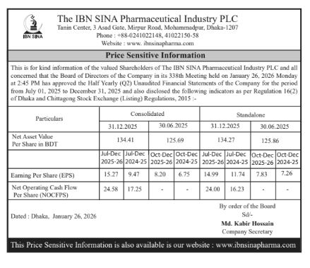 Homeপ্রাইস সেন্সিটিভ ইনফরমেশনPrice Sensitive Information(Q2): The IBN SINA Pharmaceutical Industry PLC. Your browser does not support the video tag. Price Sensitive Information(Q2): The IBN SINA Pharmaceutical Industry PLC. জানুয়ারি ২৬, ২০২৬ Share FacebookTwitterPinterestWhatsApp Share FacebookTwitterPinterestWhatsApp Previous articleকপারটেক ইন্ডাস্ট্রিজের বোর্ড সভা ২৯ জানুয়ারিNext articleআবগারি শুল্ক বিষয়ে এনবিআর চেয়ারম্যানের সাথে আইবিসিএফ প্রতিনিধিদলের সাক্ষাৎ RELATED ARTICLES প্রাইস সেন্সিটিভ ইনফরমেশন Price Sensitive Information (Dividend): Nitol Insurance PLC এপ্রিল ১, ২০২৬ প্রাইস সেন্সিটিভ ইনফরমেশন Price Sensitive Information: Pubali Bank PLC মার্চ ১১, ২০২৬ প্রাইস সেন্সিটিভ ইনফরমেশন Price Sensitive Information: Pubali Bank PLC মার্চ ১১, ২০২৬ Most Popular প্রধানমন্ত্রীর বিনিয়োগ ও পুঁজিবাজার বিষয়ক বিশেষ সহকারী হলেন তানভীর গনি এপ্রিল ২, ২০২৬ ন্যাশনাল ফিড মিলের লভ্যাংশ বিতরণ এপ্রিল ২, ২০২৬ আরডি ফুডের উদ্যোক্তার শেয়ার বিক্রি এপ্রিল ২, ২০২৬ ইন্ট্রাকোর ক্রেডিট রেটিং মান প্রকাশ এপ্রিল ২, ২০২৬ Load more Recent Comments