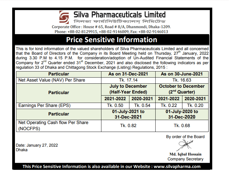 Homeপ্রাইস সেন্সিটিভ ইনফরমেশনQ2 Price Sensitive Information of Silva Pharmaceuticals Ltd. Your browser does not support the video tag. Q2 Price Sensitive Information of Silva Pharmaceuticals Ltd. জানুয়ারি ২৭, ২০২২ Share FacebookTwitterPinterestWhatsApp Share FacebookTwitterPinterestWhatsApp Previous articleQ2 Price Sensitive Information of Zaheen Spinning Ltd.Next articleসিলভা ফার্মাসিউটিক্যালসের ইপিএস বেড়েছে RELATED ARTICLES প্রাইস সেন্সিটিভ ইনফরমেশন Price Sensitive Information (Dividend): Nitol Insurance PLC এপ্রিল ১, ২০২৬ প্রাইস সেন্সিটিভ ইনফরমেশন Price Sensitive Information: Pubali Bank PLC মার্চ ১১, ২০২৬ প্রাইস সেন্সিটিভ ইনফরমেশন Price Sensitive Information: Pubali Bank PLC মার্চ ১১, ২০২৬ Most Popular বিকেলে আসছে ৫ কোম্পানির ডিভিডেন্ড ও ইপিএস এপ্রিল ২২, ২০২৬ বিএসইসি ও আইডিআরএর নেতৃত্বে আসছে বড় পরিবর্তন এপ্রিল ২১, ২০২৬ ব্লক মার্কেটে লেনদেন ৩০ কোটি টাকার এপ্রিল ২১, ২০২৬ বোর্ড সভার তারিখ জানিয়েছে ২৭ কোম্পানি এপ্রিল ২১, ২০২৬ Load more Recent Comments