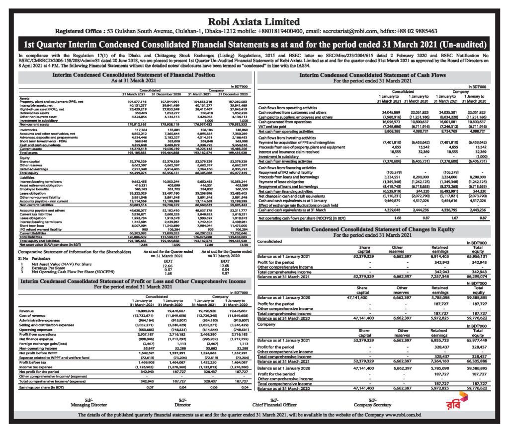 Robi Axiata Ltd: 1st Quarter Financial Statements,2021